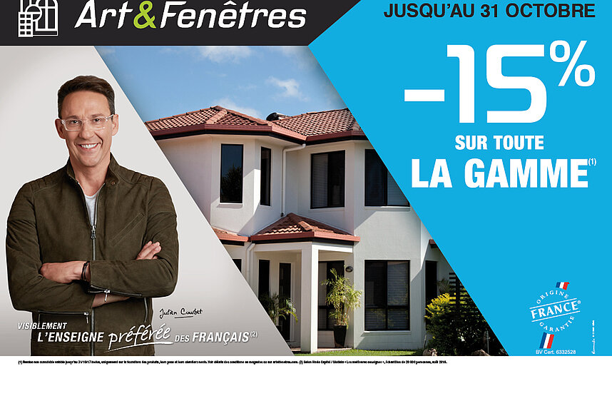 (1) Remise non cumulable valable jusqu’au 15/10/18 inclus, uniquement sur la fourniture des produits, hors pose et hors chantiers neufs. Voir détails des conditions en magasins ou sur artetfenetres.com. (2) Selon étude Capital / Statista « Les meilleures enseignes », échantillon de 20 000 personnes, août 2017. (3) selon législation en vigueur.