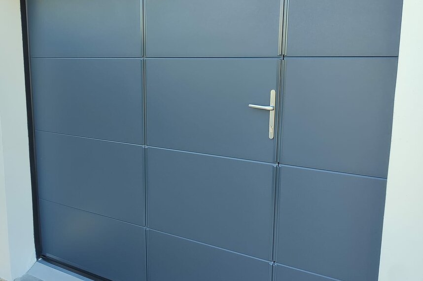 Ce modèle de porte de garage intègre un portillon, parfait pour les allers-retours quotidiens à pied ou à vélo, sans avoir à ouvrir toute la porte sectionnelle.