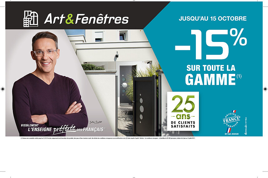 Offre valable jusqu’au 15 octobre sur l’ensemble des produits Art & Fenêtres : fenêtres, portes, volets, portails.